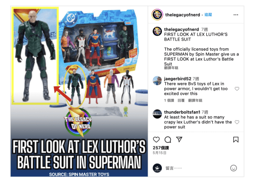 在事前流出的《超人》周边玩具里,我们可以看到毫无超能力的路瑟,穿上他的战斗盔甲。但事实上电影里没有出现路瑟“钢铁人”造型,相反的,这套盔甲其实更像是片中路瑟的私人军队“勐禽部队”的盔甲,造型设定很类似,配色与功能也非常类似。