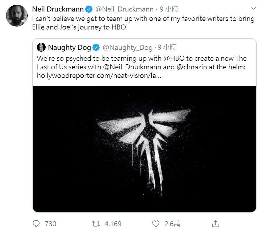 德鲁克曼在推特转发 ” 顽皮狗 ” 的推文写道:” 我不敢相信我们会和一位我最喜爱的编剧合作,将艾莉和乔尔的旅程带到 HBO。”