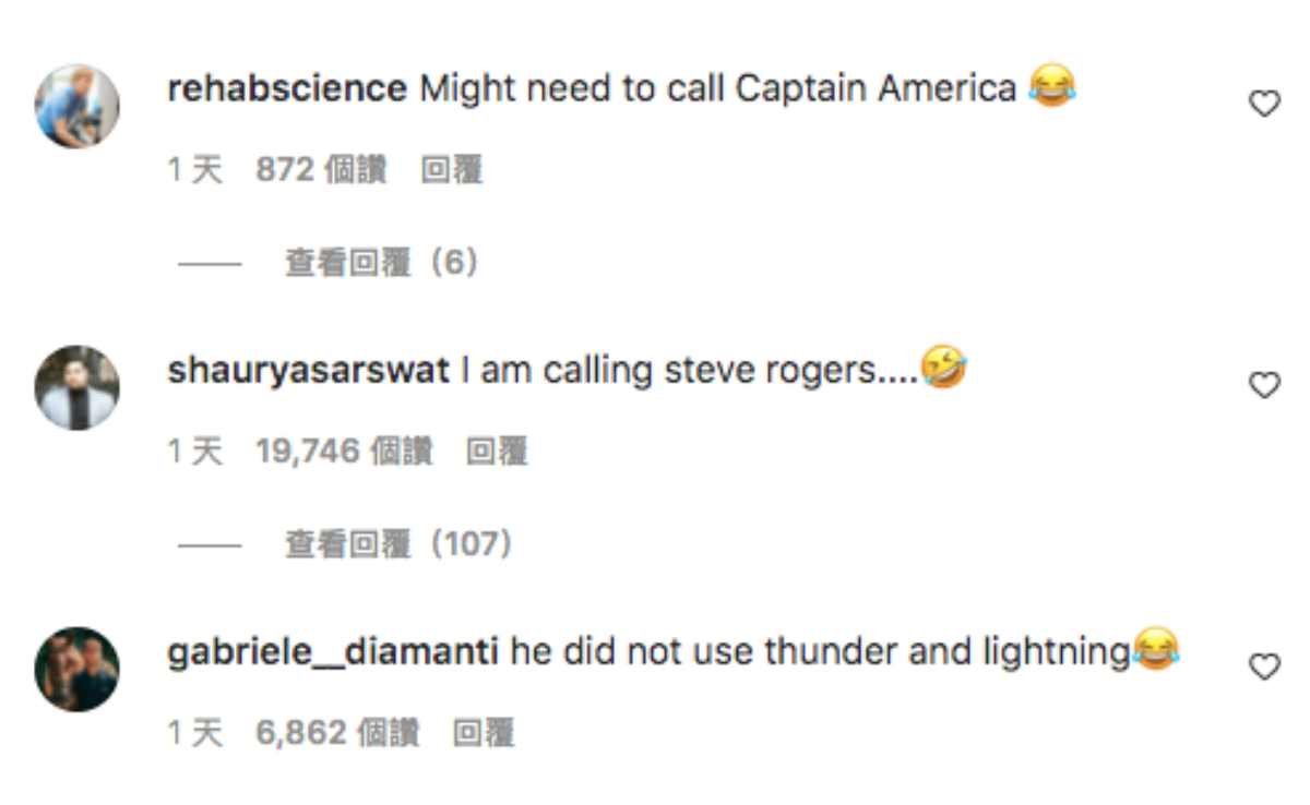 这段影片一上传后,立即吸引超过全网 300 万人的朝圣,不仅有人说 ” 看来索尔有点生疏惹 ”、” 索尔你还没加上闪电一起劈 ”,而最多人在说的就是 ” 快叫美国队长来!” 让这位身材也是壮到不科学的漫威英雄让你看看什麽叫劈柴~