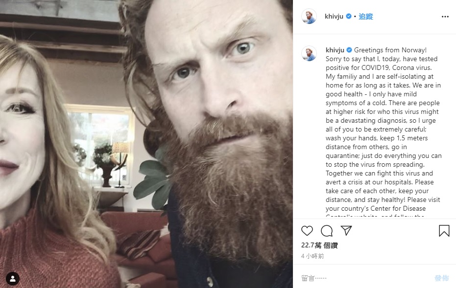 克里斯多夫黑维尔在 Instagram 上发布确诊消息,指出他和家人正在家自我隔离。家人们健康状况良好,唯独他自己有一点轻度的感冒症状。