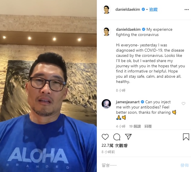 《檀岛警骑 2.0》(Hawaii Five-O)男星 20 日在 Instagram 上公开自己确诊新冠肺炎,并在长达 10 分多钟的影片中,分享近况与对抗病毒的过程。