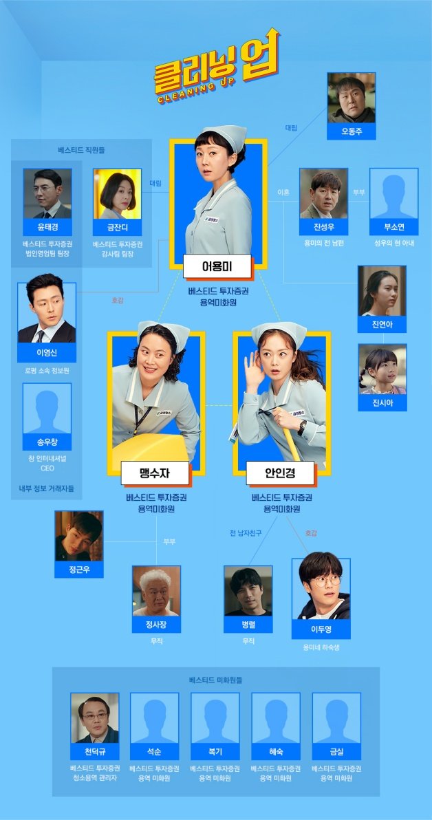 爆米花小姐特别送上 ” 人物关系图 ”,以鱼容美、安仁景和孟秀子三位清洁工为事件中心,他们的身边都不约而同有烂男人,不管是外遇劈腿的前夫、寄生在家中的前男友,还是看不起老婆的丈夫,其中又以 ” 鱼容美 ” 为主要人物,她周边还有高利贷 ” 吴东柱 ”、监察部组长 ” 金赞袛 ” 和营业部组长 ” 尹泰京 ” 等,不仅如此,容美居然还有感情线,内线交易者李永信认识她之后,逐渐产生好感!